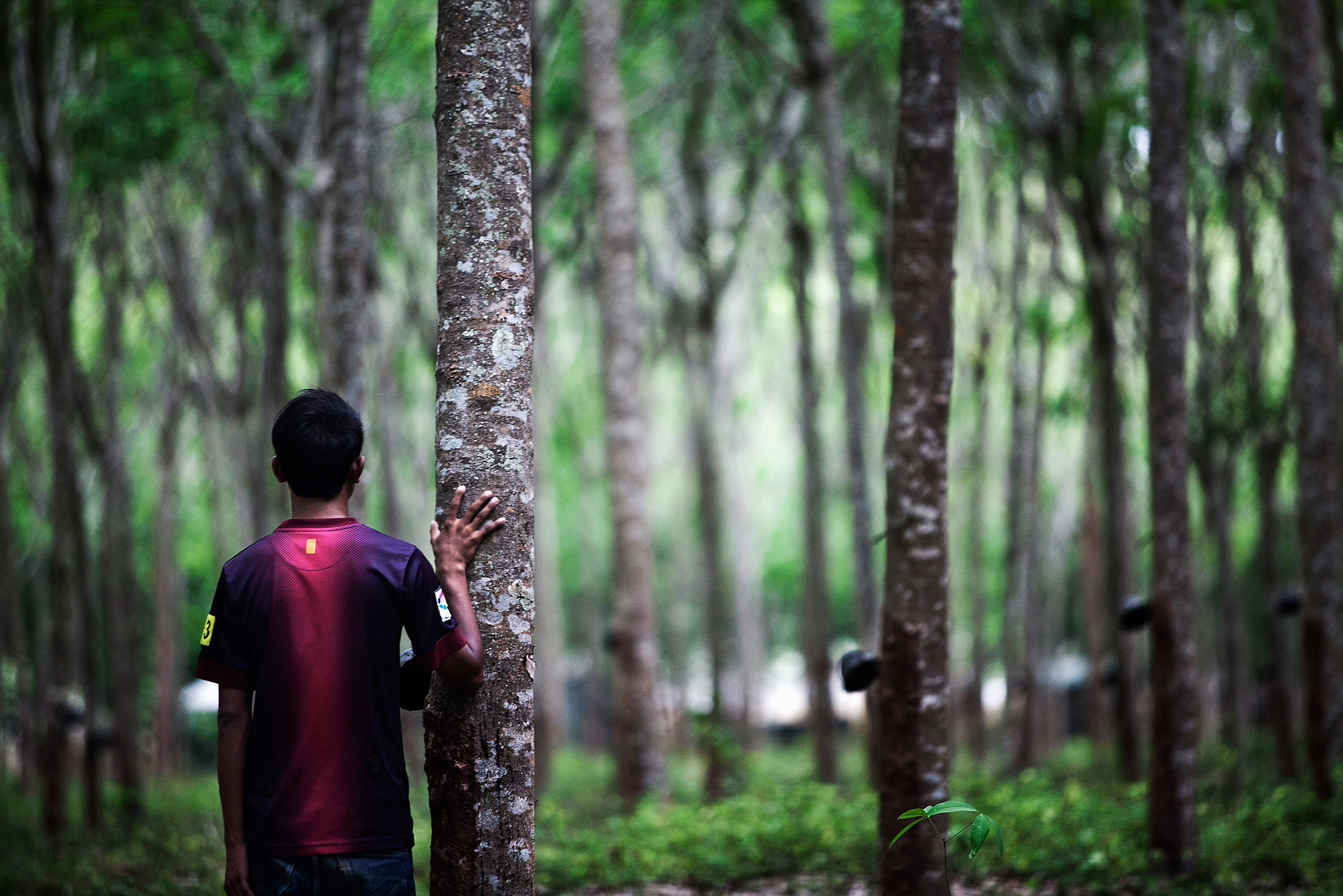 • Worker of Siam Semperemed at rubber tree plantation. Reportage of labour rights violations in medical glove production in Thailand.